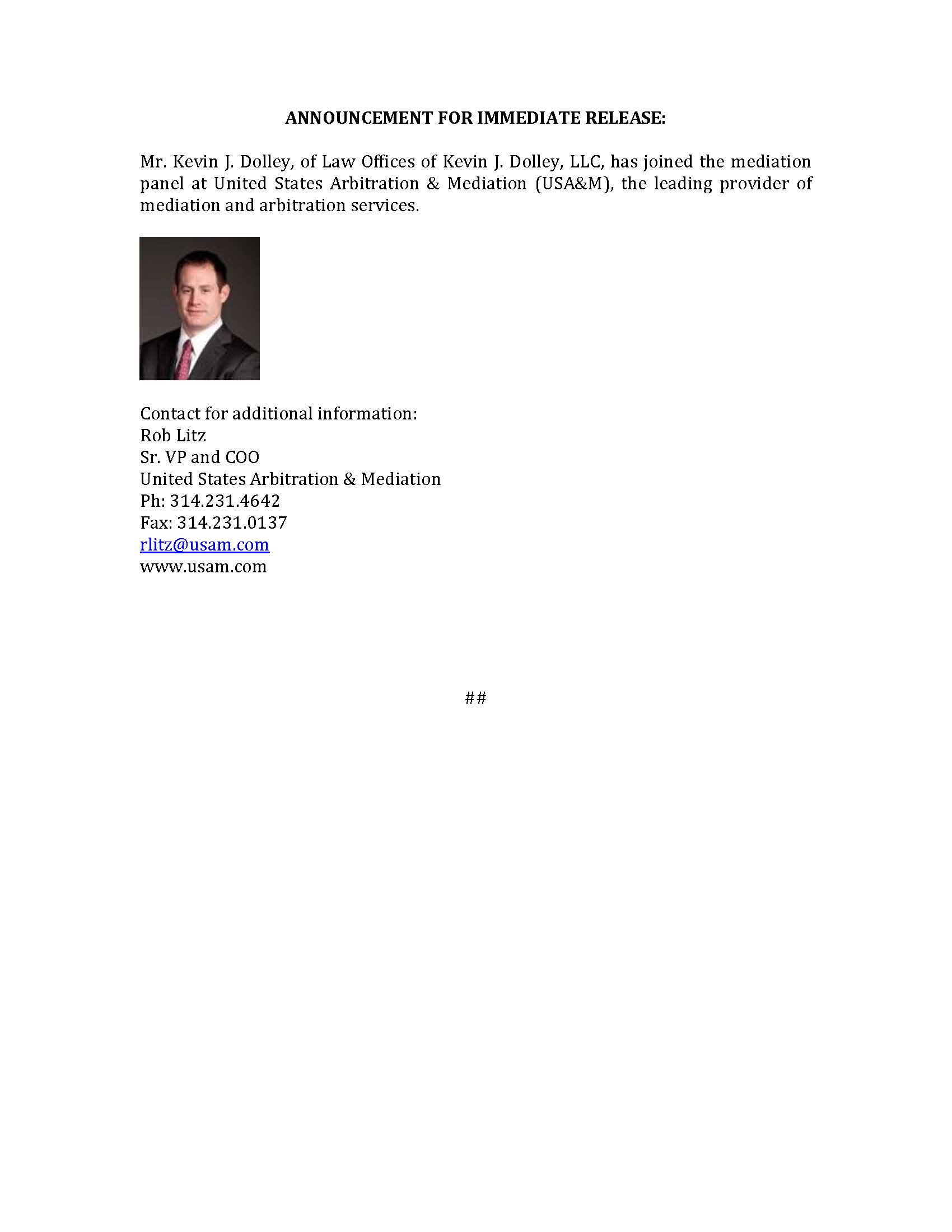 Kevin Dolley Joins USA&M Mediation Panel - December 2014