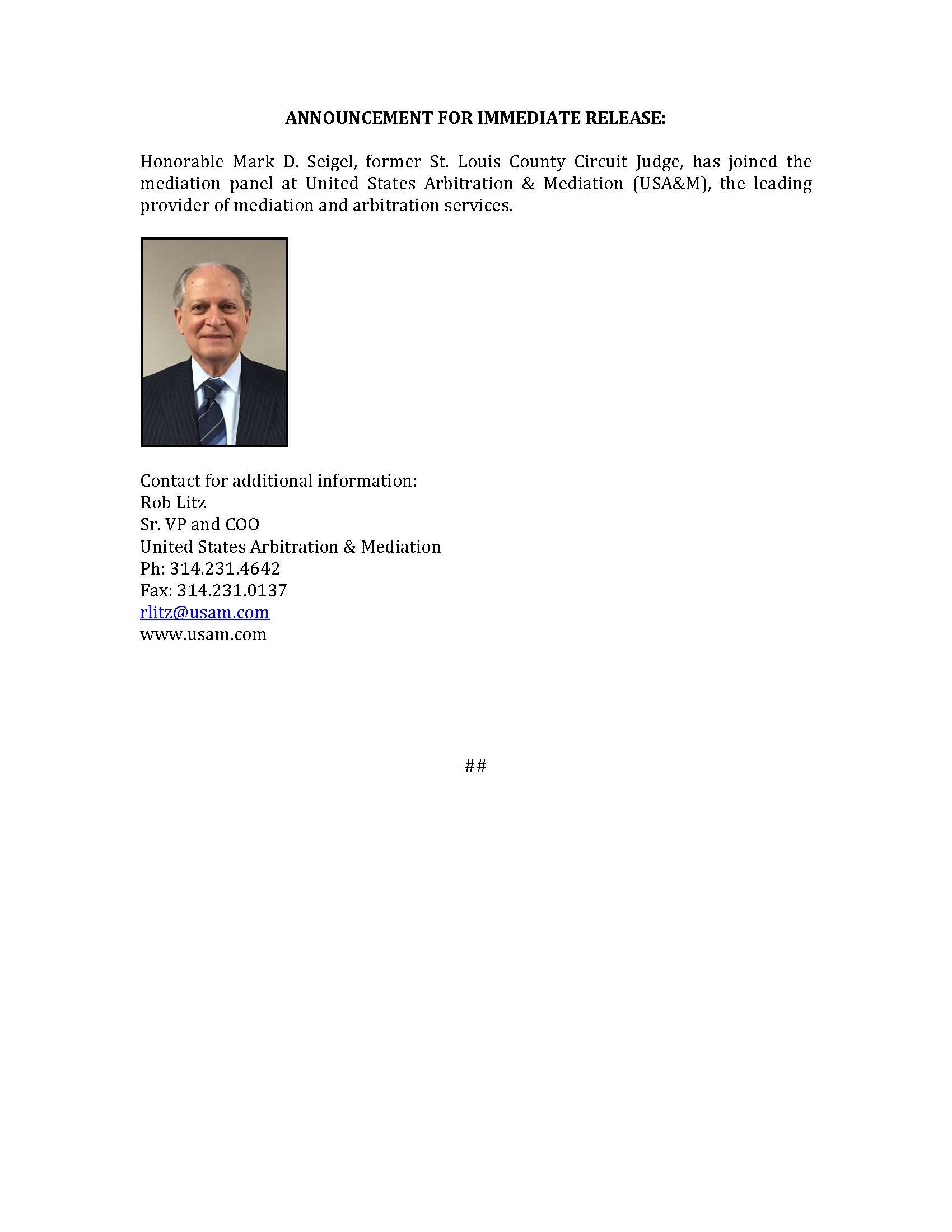 Judge Seigel Joins USA&M Mediation Panel - December 2014