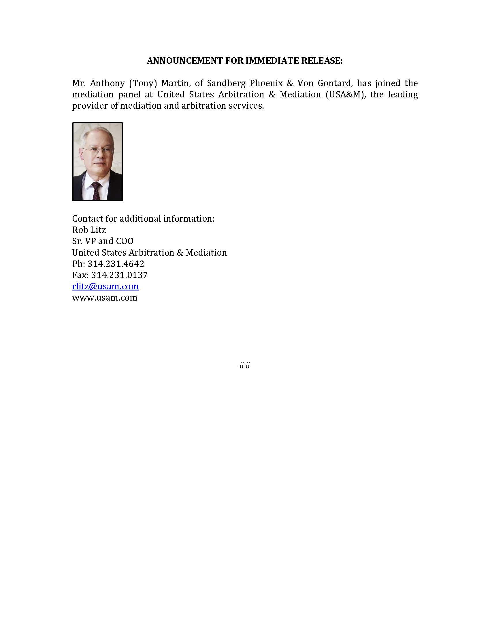 Anthony (Tony) Martin Joins USA&M Mediation Panel - December 2014